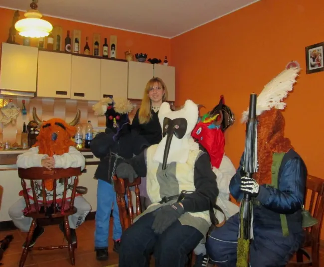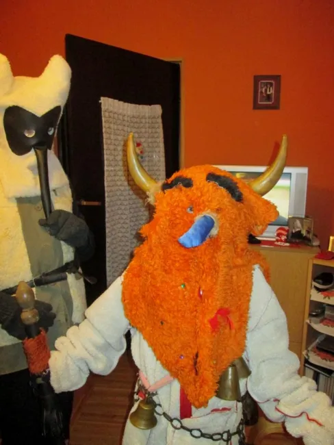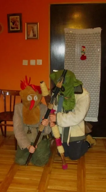 A köszöntőket a gazda behívja, és étellel, itallal kínálja. A régi hagyományhoz híven az énekes csoportokat két jelmezbe öltözött, maszkos "csuma" kíséri, ők a csoport hírnökei, előre mennek a házhoz. Éneklés alatt bent a házban letérdelve, keresztben tartott botokkal hallgatják a háziakkal együtt az énekeseket. A csuma öltözéke egy kifordított báránybőr bunda, derekán csengettyűk és kolompok vannak, minél több, hogy kellő zajt keltsenek. Fején álarcot, kézzel készített maszkot visel, és kezében tartja a csumabotot, amit szintén ő készít és díszít. Fontos, hogy felismerhetetlen maradjon.