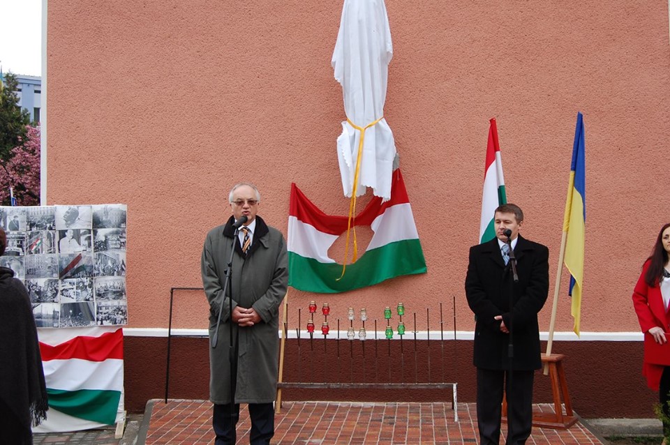 Rahó képviseletében a város jegyzője, Brehlicsuk Dmitro köszöntötte az ünneplő közösséget. A rövid történelmi áttekintés után a kárpátaljai események egyik élharcosa, Milován Sándor úr mondott ünnepi beszédet. Milován Sándort forradalmi tevékenységének elismeréseként 1992-ben ’56-os emlékéremmel tüntették ki, majd 2006-ban az 1956-os magyar forradalom és szabadságharc 50. évfordulója alkalmából átvehette a Magyar Köztársasági Érdemrend Lovagkeresztjét is. Milován úr fontos feladatának tekinti a forradalom méltatását, az emlékezést. Az ’56-os események megértéséhez az I. Világháború eseményeihez kell visszamenni. Majd a II. Világháború után ismét bevonultak a szovjetek Magyarország területére. Sötét időszak volt ez a magyarok számára, hiszen velünk sokkal keményebben bántak, mint a lengyelekkel, vagy csehszlovákokkal. Ezért kelt fel a magyar nép ’56. október 23-án, és ezért sikerült ilyen véresre a forradalom. Ezután az egyetemes világtörténelem, majd a magyar történelem palettáján is elhelyezte ezt a történelmi eseményt. A világtörténelemben az első igazi csapást Magyarország adta a kommunista uralomnak. Hangsúlyozta, hogy nem a fegyverek miatt, hanem mert lerántotta a leplet a Szovjetunióról, hogy soha nem fog megváltozni, mindig egy terrorállam lesz. Az egész nyugati társadalom addig elhitte ezt az álságos hazugságot, amely arról szólt, hogy lesz majd egy emberarcú szocializmus. Milován Sándor szerint éppen ezért a világtörténelemben egy fényes lappal kellene jelezni a magyar forradalmat. Sajnos azonban ez nem így van, mert 1956. október 29-én kirobbant a Szuezi válság. Ezek után az USA elnöke biztosította a szovjet vezetést, hogy nem fognak közbe avatkozni, vagyis tulajdonképpen szabad kezet kaptak a szovjetek. Ezzel megpecsételődött a magyarok sorsa. Zárógondolatként elmondta, hogy mióta Magyarországnak nemzeti kormánya van, azóta 1956. a magyar történelemben helyére került. Elfoglalja a helyét az 1703-as Rákóczi-féle szabadságharc, valamint az 1848-49-es forradalom és szabadságharc mellett a dicsőséges események sorában.