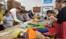Saját feladatom ezen a napon a kézműves szobába, a nemezelő asztalhoz szólított, ahol Kiss Andorral és Verával közösen ez alkalommal (a programsorozatunkban először) a nemezelés rejtelmeibe vezettük be a gyerekeket. Ez a folyamat, a közös alkotás is maga a csoda: látni, ahogy a száraz, színes gyapjúcsíkok a szappanos-vizes simogatás, a tenyérben való türelmes sodrás, majd a határozott, tömörítő mozdulatok hatására a legapróbb kezekben is különböző színű nemezelt, tömör kis golyóbisokká formálódnak.