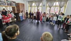 A délután most is két teremben, egymással párhuzamosan zajlott. Míg a kézműves szobában a csendesebb alkotás zajlott, házigazdánk, a Körtvélyfájai Bokréta Néptánccsoport tükrös próbatermében Bíró Júlia vezetésével néhány farsangra hangoló dal közös eléneklése után egyenesen a farsangi alakoskodók birodalmába csöppenhettünk közös játékokkal és dalokkal: volt ott barlangjában alvó medve, akit a gyerekeknek kellett felébreszteniük, és mocsárban vadászó gólya is, aki elől a békáknak el kellett bújniuk.
