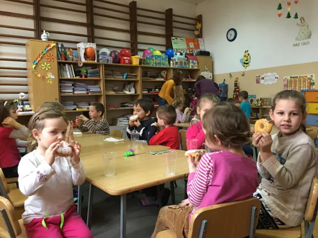 A sok móka és kacagás mellett a gyermekek megkóstolhatták a hagyományos farsangi fánkot is.