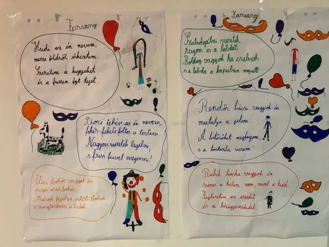 jelmezfigurákat, ezurán közösen kis versikét írtak önmaguk jellemzésére. Költeményeiket tanítójuk, Soaca Erika útmutatása alapján, egy kis plakáton örökítették meg, önmagukról rajzot is készítettek. A szüleik számára összeállított műsorukban előadták a maguk kreálta rövid versikéiket. Mary Poppins, Heidi, Vérszívó vámpír, Hókirálynő, a Rubikkocka elvarázsolt mesevilágba repített bennünket, felnőtteket. Az ünnepség befefejezéseként a lurkók Orosz Erzsébet pedagógus által kiválasztott ügyességi játékokkal lazítottak, és elfogyasztották az összes ünnepi csörögét és fánkot.