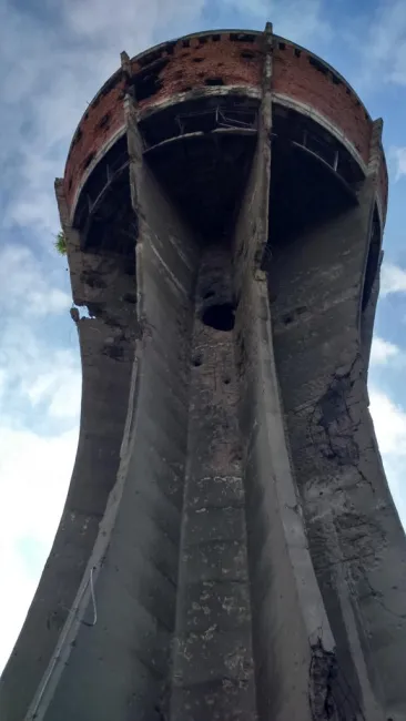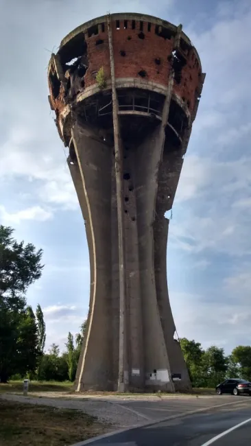 A vukovári víztorony, ahogyan a mellette álló tábla is hirdeti, 1968-ban épült. Akkoriban a közel ötven méteres magasságával, a világ második legnagyobb ilyen épületének számított. Egészen 1991-ig, a honvédő háborúig működött rendeltetésének megfelelően, körülbelül 2200 m³ vizet lehetett tárolni a kupolájában. Emellett pedig a toronybelső emeleti terében a honvédő háborúig étterem is működött. A kiszolgálóegységhez tartozó ablakok páratlan kilátást biztosítottak a környékre.