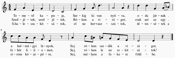 Halmágyon erre a dallamra körfogócskát játszottak. A játékosok kört formálnak, egy játékos a körön kívül sétál. A játékosok körbe állnak, s megállás nélkül, folyamatosan éneklik a játékhoz tartozó dalt. A körön kívül sétál az egyik, aki a séta közben elejt egy zsebkendőt valamelyik játékos háta mögött, aki - ha az észreveszi -, felkapja a zsebkendőt és szalad a körön kívül, kergetve a társát. Amennyiben utoléri, megérinti, és így az előző játékos marad tovább is a körön kívül. Ha azonban nem éri utol, akkor a kergetőből lesz az új, körön kívül sétáló játékos. Ha valaki észre sem veszi, hogy a háta mögött elejtették a zsebkendőt, míg a másik teljesen körbe ér, akkor az felveszi a zsebkendőt, és megtörüli az orrát!