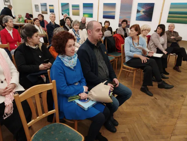 A Csemadok-székház Rákosi Ernő nagytermébe is sokan érkeztek, hogy meghallgassák az alkotó gondolatait, és megtekintsék festményeit. „Zömében friss alkotásokat láthat a közönség, amik tavaly, vagy tavalyelőtt születtek. A festészeti témám szinte mindig a természet volt, és ez ebben az esetben sincs másként.”