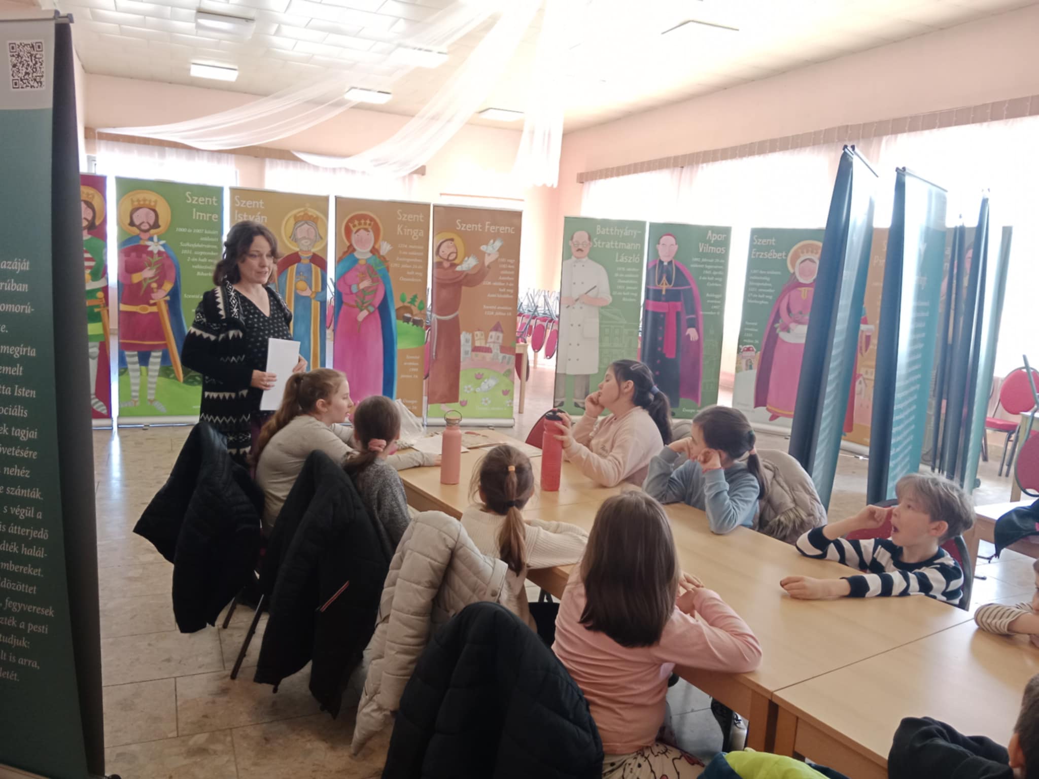 Kolonban az alapiskola magyar tagozatos diákjainak játékos, interaktív formában mutattam be a tárlatot. Nagyon sok érdekességet sikerült így megosztani a gyerekekkel. A foglalkozás során igazi időutazást tettünk a szentek legendái nyomán és az újkor szentjei is rámutattak, hogy mennyiféle úton lehet Istennel közösségben élni, akár orvosként, politikusként vagy éppen papként, püspökként, szerzetesként.