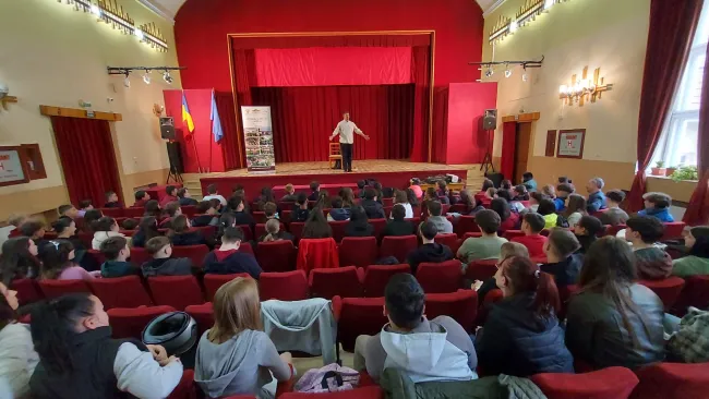 A versvándor délután egytől kezdődő, a szászrégeni Petru Maior Könyvtárban tartott előadásával már az Alexandru Ceușianu iskola felsős, magyar tagozatos diákjaihoz szólt. „Vasútállomás” című pódiumműsorában mesélt az árvaságból, a mélyszegénységből kitörni vágyó fiatal, József Attila küzdelmes életéről, az első szárnypróbálgatásairól, a középiskolás és egyetemi éveiről: arról, hogy ez a szeretetre és szeretni vágyó fiatalember hogyan akarta tanulással, szorgalommal, kitartó munkával, tiszta szívvel, hittel a szívében megváltoztatni az életét.