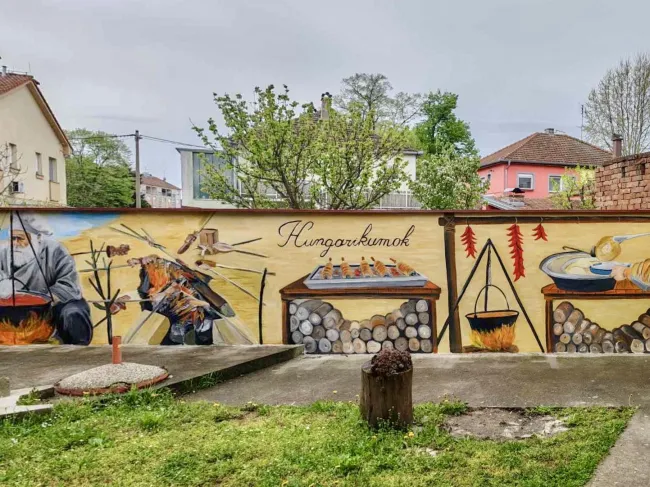 Az udvar ezen része is fontos az egyesületnek, hiszen ezen a kis zöld területen zajlanak a szabadtéri sütések-főzések. Ezért döntöttek úgy a tagok, hogy falfestményen is megjelenítik azokat a hagyományos magyar ételeket és tevékenységeket, amiket annyira szeretünk.