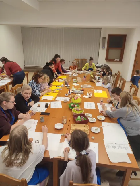 2026. március 30-án, hétfőn Galántán a Pázmány Péter Alapítvány székházában tartottuk a második tojásírást. Ez a rendezvény elsősorban aSzakkör Gyöngyfűzés foglalkozások tagjait vonzotta, azonban más galántaik előtt is nyitva állt a lehetőség a csatlakozásra. Mivel a rendezvény aSzakkör Gyertyaöntés és a Ringató foglalkozással időbeli átfedésben zajlott, így a Ringatóra érkezők közül is sokan kedvet kaptak: a Ringató előtt és után érdeklődve szemlélték, mi történik a nagyteremben, és aki nem tudta aznap befejezni az alkotását, azt meghívtuk a másnapi húsvéti játszóházba.