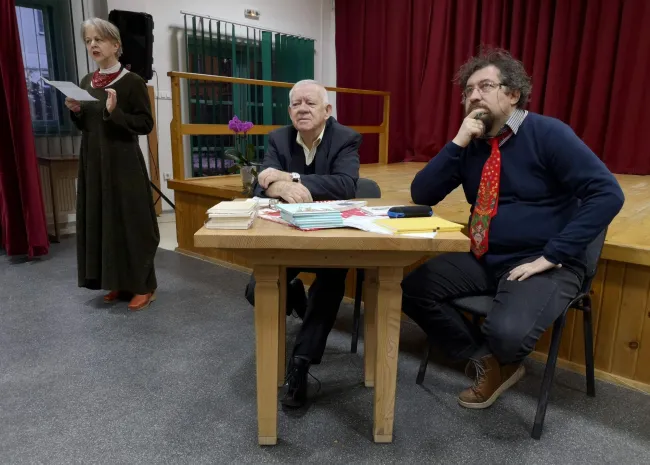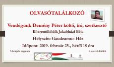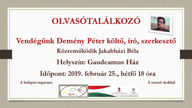 2019. február 25-én, hétfőn, 18 órától könyvbemutatót és olvasótalálkozót tartottunk a segesvári Gaudeamus Ház művelődési termében, ahol Demény Péter kolozsvári születésű, Marosvásárhelyen élő költő, író, szerkesztő könyveiről és könyveinek irodalmi hátteréről beszélgettünk, az ankét moderátora, Jakabházi Béla, nyugalmazott segesvári magyar tanár narratív felvezetője után.
