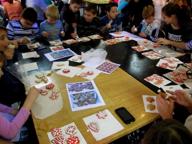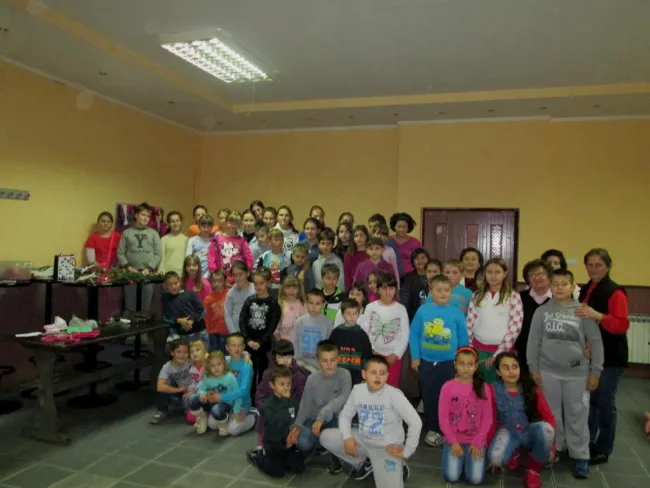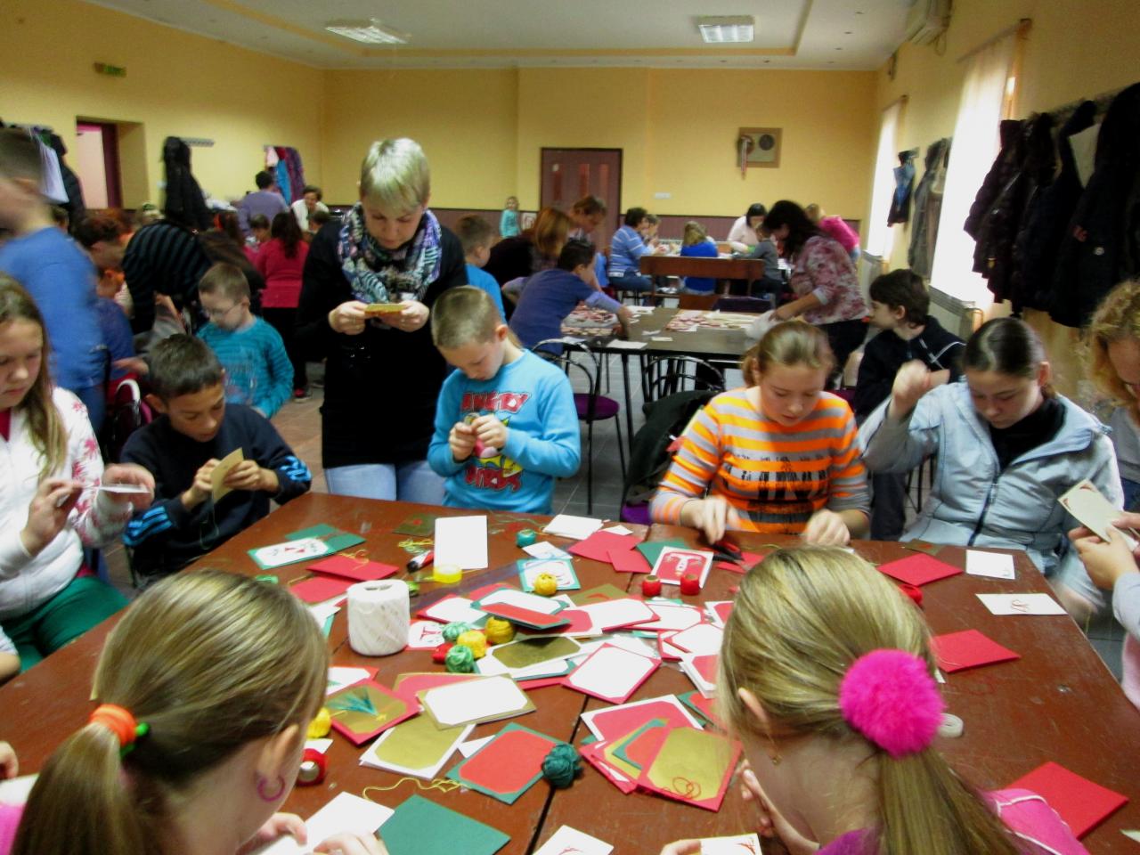 A kézműves napot szombaton, november 21-én tartottuk, körülbelül 80 gyerek és felnőtt érkezett Székelykevéről és 35-en Hertelendyfalváról. A reggeli órákban türelmetlenül és kíváncsisággal várakoztak a gyerekek a művelődési otthon termében, amely helyet adott a rendezvénynek. Hat asztalon előkészített különféle színes anyagok sokasága várta a munkára felkészült alkotókat és oktatóikat. A helyiek segítségével gyönyörű adventi koszorúkat, karácsonyi ajtó és asztal díszeket készítettek, az első asztalnál, kizárólag a természetből beszerzett anyagok felhasználásával. A második asztalnál a mézeskalács készítését, díszítését próbálhatták ki, amelynek egy részét a székelykevei asszonyok ott, helyben sütötték. Harmadik foglalkozásként a gyöngyfűzést választhatták a gyerekek. Nemcsek Klaudia, Lőcsei Márta, Nagy Mónika, Kiss Krisztina, Györfi Hajnalka másik három asztalnál az ünnepi alátétek és képeslapok készítésében segítettek. A fonalgrafikával készült karácsonyi üdvözlőlapok készítéséhez szükséges technika elsajátítását és a szövést tanítottam. Foglalkozásként a varrást és a szövést választottam, hogy a gyerekek közelebb kerüljenek a népi mesterségek ismeretéhez és mindkét településen jó lenne, ha a guzsalyas estéken a nagyobb gyerekek is részt vennének és megismerkednének a székely varrottasok készítésével, ők adhatják tovább a népi hagyományt. Az örömet és sikerélményt táncházzal zártuk, Kiss Zoltán vezetésével bukovinai és moldvai táncokat tanultunk, jártunk el a gyerekekkel közösen.