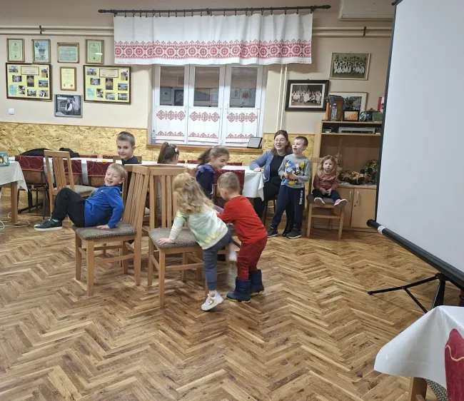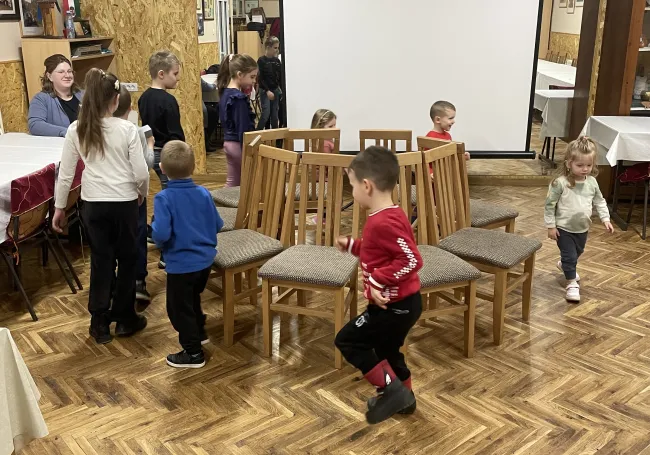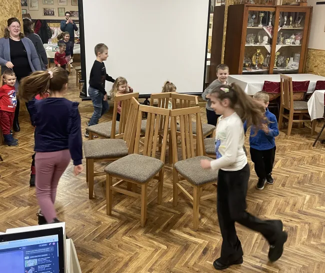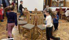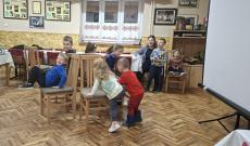 Ezt követően két rövidfilmet is megnéztünk, amelyek az érzelmi, szociális és kognitív fejlesztés mellett ennek az ünnepnek a világunkban betöltött szerepét mutatták be. A nagy elmélyülést hozó filmvetítést követően két igencsak felpezsdítő csoportos játék került sorra, ahol az önfeledt percek - számomra, mint külső szemlélő számára - leírhatatlanok voltak. Ezután a népszerű „Székfoglaló” játék következett. Farsangi dalra sétáltak a gyerekek a kihelyezett székek körül és amikor leállítottam a zenét, mindenkinek le kellett ülnie egy székre. Aki nem talált helyet, kiesett és minden újabb kör után egy széket eltávolítottunk a játékból.