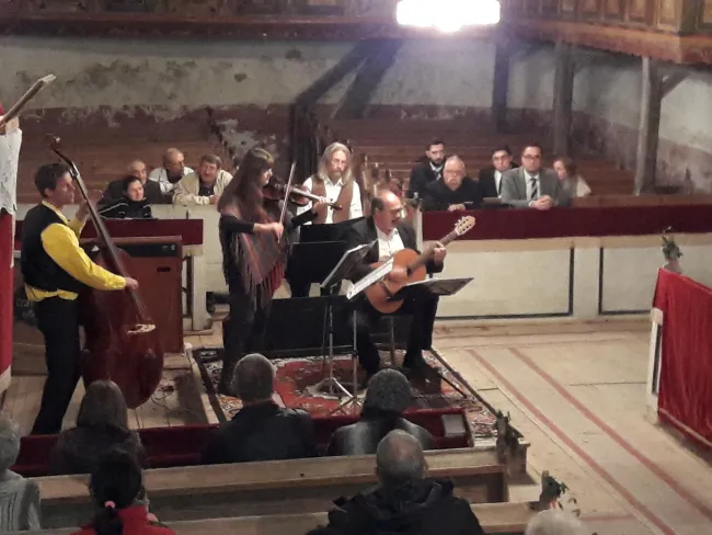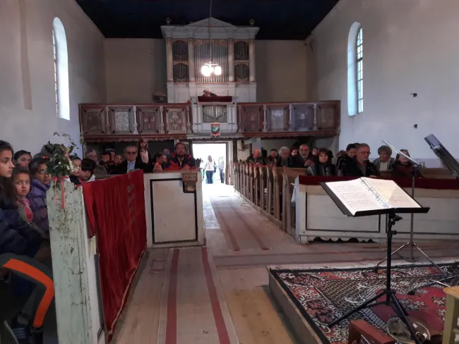 Az élő történelemleckét követően a Kőhalmi Református Egyházközség munkatársaival kiegészült csapatunk a Kárpát-medence egyetlen szász mintára épült magyar erődtemplomába, a kóbori vártemplomba vonult. A XIII. században már jegyzett erődítmény szép számú látogatóval telt meg, ugyanis a faluban német beruházásként működő ökofarm vezetői koncertet szerveztek a templomba.