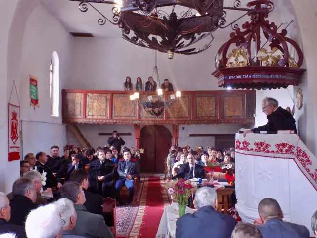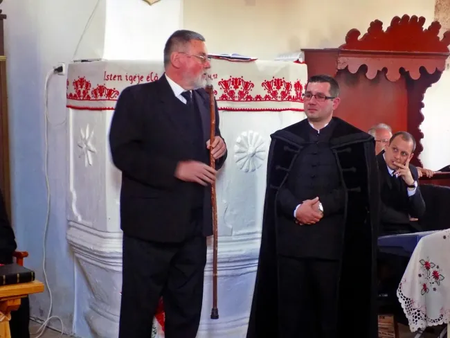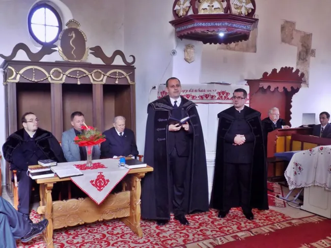 Délelőtt tizenegy órára zsúfolásig megtelt az almási református templom, ahol Hajdú-Nagy István tiszteletes urat nagytiszteletű Szegedi László Tamás, a Brassói Református Egyházmegye esperese iktatta be a helyi egyházközség lelkészi hivatalába. Prédikációjában Szegedi László Tamás esperes arról beszélt: milyen fontos esemény a lelkész és a gyülekezet életében a beiktatás. A lelkipásztor legfontosabb vizsgájaként említette, hogy mennyire tud krisztusi alázattal lehajolni és szolgálni. Bibliai példával élve (Jn 13, 1-8.) Péter nem értette meg Jézus nagycsütörtöki cselekedetét, mikor megmosta a tanítványok lábát. Jézus Krisztus példát akart mutatni, a szolgálat lényegét tanította meg azoknak, akik szolgálatra adják életüket. A boldog szolgálatnak egyetlen titka az alázat. Péter, a kőszikla mégis tiltakozásának adott hangot, hiszen ez egy olyan cselekedet, amely közmegbotránkozást okozott ama időben. A hatalom szolgálatához nem szükséges alázat. A hatalmasok elvárják, hogy őket szolgálják. A kor közfelfogása szerint megbotránkoztató volt, ha egy tanító, egy rabbi megmosta a tanítványai lábát. Az utolsó vacsorán a szolgálat alázatáról tanított Jézus Krisztus, amit a tanítványok nem értettek meg, még Péter sem, akire a későbbiekben az egyház sorsát és jövőjét bízta. Péternek fordított tapasztalata volt: a nagyurakat a kisemberek szolgálták. Ezért a legfőbb vizsgája egy lelkipásztornak, mennyire tud krisztusi alázattal, odahajló szerető szolgálattal az emberek elé állni? – hangsúlyozta Szegedi László Tamás prédikációjában, biztatva Hajdú-Nagy Istvánt és feleségét, Ilonkát, sok-sok példát felsorolva a saját életből is merítve, hogy Istennek célja van azzal, hogy őket Küküllőalmásra helyezte. Egy olyan csodálatos szolgáló életet kívánt az ifjú lelkésznek és feleségének, amiben nem lehet kiégni, és őszülő halántékkal is úgy lépjen majd a szószékre, hogy lelkesedéssel, erőbevetéssel, némelykor megfáradva ugyan, de mindig újrakezdve tudja szolgálni Küküllőalmás és Somogyom áldott népét, az anyaszentegyházat és a magyar nemzetet.