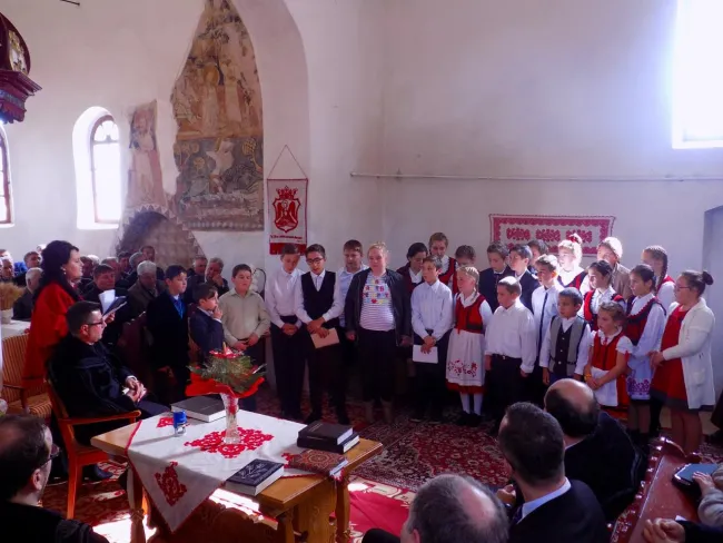 Szép napsütéses októberi nap volt szombaton, október 15-én, amikor Küküllőalmás kicsinyke ősi református temploma zsúfolásig telt. Mintha Isten külön figyelmet fordított volna az almásiakra, amikor is egy szórványfalu életében ezen a ritka szép napon még véletlenül se legyen borongós a Nagy-Küküllő feletti ég. Az emberek csendben beszélgetve gyülekeztek a faluból, sokan átjöttek Somogyomból, valamint az egyházmegyéből és távolabbi vidékekről is érkeztek vendégek.