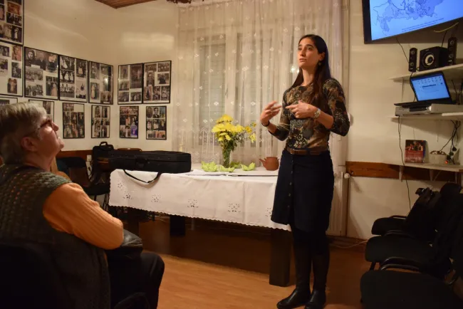 A beszélgetés után Nagy Bence közreműködésével (aki Drávaszögben és Moldvában töltötte szórványgondozó munkáját) gyimesi és felcsíki népzenét hallgattunk, és megismerkedtünk az ütőgardonnal, az erre a tájegységre jellemző hangszerrel.
