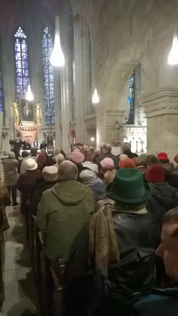 A templom és a mellette található temető egykor fontos találkozási helynek számított a magyar hívők körében, akkoriban még augusztus 15-én találkoztak itt, és tartották meg az ünnepet. A templom melletti temetőben található az ausztriai magyarok szimbolikus sírja is, melyet az ide temetkezett 1956-os menekültek sírjából alakítottak ki. Ennek a megkoszorúzását az emlékezést elindító és a sírt ápoló egyesület megszűnése után – a már majdnem feledésbe merült zarándokhelyen - 2004 óta az „Europa”-Club indította újra. A sír mellé felállított kopjafát a felvidéki és magyarországi magyarokkal azóta minden évben megkoszorúzzák, viszont a régi tradíciókkal ellentétben nem augusztusban, hanem, mint ahogy idén is, novemberben, halottak napját követően, így emlékezve a hazájuktól messze eltemetett magyarokra. Dr. Smuk András a templomon kívül és belül található további magyar emlékekre is felhívta a figyelmet: a templom oldalbejáratával szemben látható Szent Istvánt ábrázoló gótikus mozaiküvegre, a bal mellékoltáron szintén Szent Istvánt ábrázoló festményre, amelyet gróf Koháry István országbíró 1726-ban ajándékozott a templomnak, továbbá az oltár körüli üvegablakokra, amelyek a II. világháború során mind kitörtek. Ezeket 1959-ben, egy bécsi magyar művész, Deéd Ferenc tervei alapján készítették el újra. Az ismertető után köszöntötte a vendégeket, majd elmondta, hogy 2016. május közepén egy Szent István mellszobor felállítására kerül sor a templom előtti parkban, melynek megvalósítására a november 10-én, külön e célból megrendezésre kerülő, nagyszabású jótékonysági hangverseny bevételéből és a beérkezett adományokból lesz majd lehetőség.