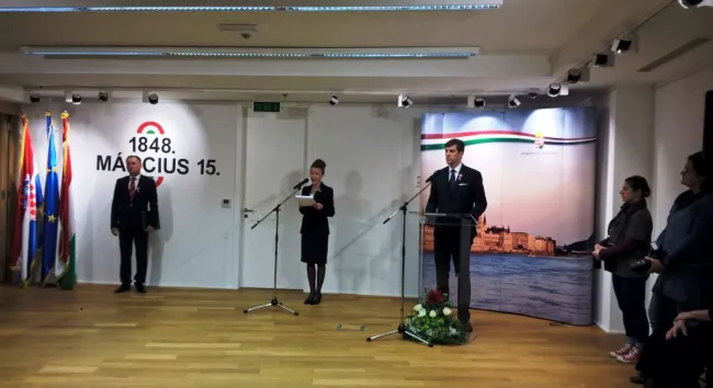A koszorúzást követően a zágrábi Magyar Intézetben a zágrábi Magyar Nagykövetség rendezett fogadást. Az Ady Endre Magyar Kultúrkör vegyeskara a hagyományoknak megfelelően a Himnusszal nyitotta a rendezvényt, majd 1848 szelleméről, üzenetéről, napjainkban való aktualitásairól beszélt dr. Szilágyi Péter és Magyar József, aki Orbán Viktor miniszterelnök úr külhoni magyarokhoz szóló ünnepi üzenetét is továbbította. A rendezvényen Milan Bandić, Zágráb polgármestere is szólt néhány szót a horvát-magyar kapcsolatokról, a magyar forradalom jelentőségéről.
