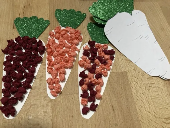 A foglalkozásokat követően kézműveskedéssel is készültem a kicsiknek. A "Visszajött a répa" meséhez kapcsolódóan a gyerekek egy-egy répát díszíthettek morzsolt krepp papírral.