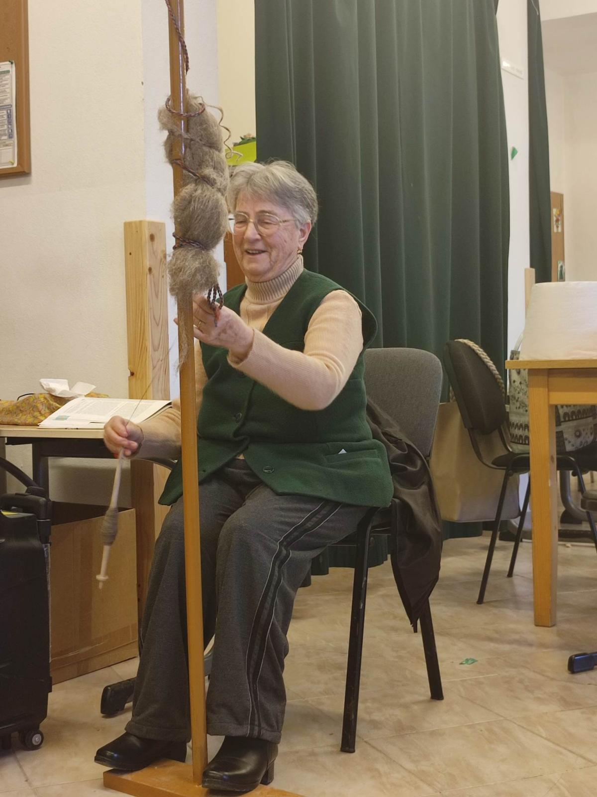 Szerencsére a mostani alkalomra nyolc idős hölgy is ráért, hogy továbbadják az évek alatt felhalmozott rengeteg tudást a fiatalabbaknak. A múltkori alkalmon nagy sikere volt a fonal készítésnek, így most is magukkal hozták a guzsalyast.