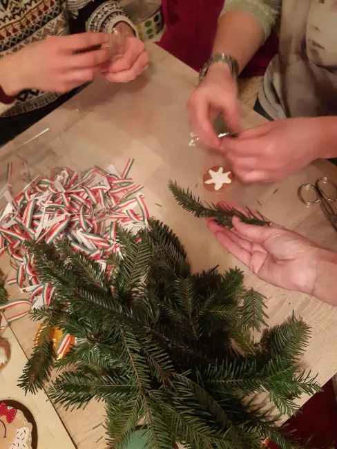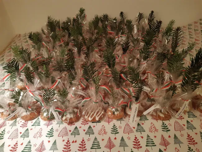 Miközben ezekről beszélgettünk, kezünk alatt megszülettek az első mézeskalácsok, s sütés után a díszítésnek sem szabtunk határokat. Nagyon jó hangulat közepette több száz szebbnél szebb mézeskalács pihent meg a tálcákon. A mézeskalácsokat becsomagoltuk celofánba, kis fenyőággal díszítve és nemzeti szalaggal átkötve. Összesen 170 darab ajándékcsomagot készítettünk el.