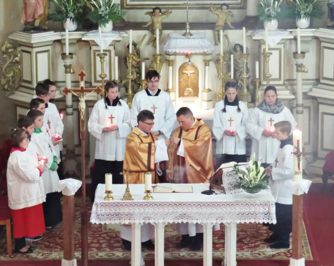 Nagycsütörtökön, az utolsó vacsorára emlékezve tovább folytatta szolgálatát kórusunk egy- és többszólamú művek előadásával. Nagypénteken ismét énekszó elevenítette fel Megváltónk kereszthalálának fájdalmas történetét. Szombat este, a Feltámadási szentmisén a gyönyörű dallamokon túl vizuálisan is csodálatos élményekben részesedhettek a jelenlévők: leoltott lámpák alatt, égő gyertyákkal kezükben vonultak templomunkba ministránsaink, és fokozatosan gyújtották meg minden hívő mécsesét, míg az egész tér a reménység fényben ragyogott. Húsvétvasárnap reggel került sor az ételes kosarak megszentelésére. Az emberek tojást, sonkát, kalácsot, és egy kis bort hoztak az úr színe elé, hogy áldásával fogyaszthassák azokat e szent reggelen. Néhány órával később kezdetét vette a húsvétvasárnapi szentmise, ahol a hangulatot ugyancsak kórusunk énekei emelték az égig. Boldog vagyok, hogy ezt a szívet melengető ünnepet is megélhettem Szilágysomlyón.