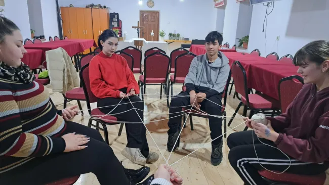 A foglalkozásokat a nyelvünk és motívumaink gazdagságának kihangsúlyozása köré építettem. Így született meg bennem az ötlet, hogy a „Hálót sző a pók” játék mintájára mondjuk el egymásnak kedvenc magyar szavainkat. Ehhez egy gombolyagot használtunk, amit egymásnak adogatva egy pókháló formát alakítottunk ki. A játék végeztével felidéztük egymás kifejezéseit, visszatekerve a fonal szálait. Az elhangzottak között többek között a szeretet, imádság, kultúra, iskola, tél szavaink is szerepeltek. Ezeknél a tevékenységeknél mindig örömmel tölt el, hogy azok a gyerekek is megszólalnak, akik pár hónapja még egyáltalán nem beszéltek magyarul. A foglalkozásokon mindemellett képeslapokat is készítettünk. A gyerekek a magyar népmesék legismertebb motívum mintáját színezhették ki. Ezek hátulját megcímezhették, és kedves gondolatokkal egészíthették ki.