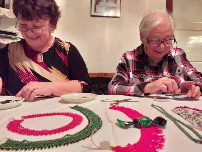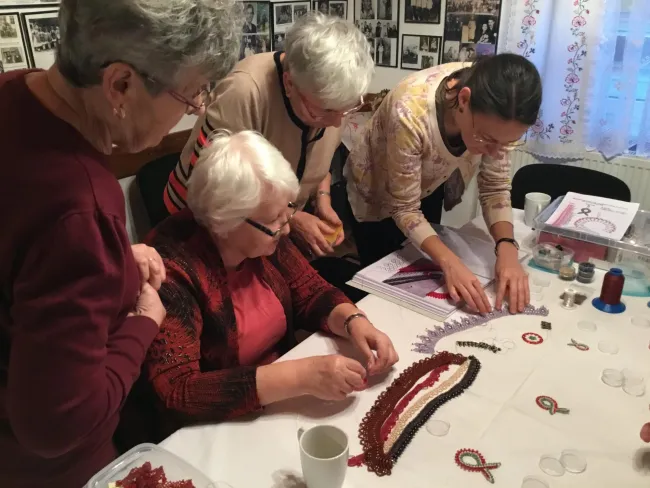 A vukovári asszonyokkal a népi gyöngyfűzés elemeire építjük alkotásainkat, mivel számtalan tájegység és annak stílusa létezik, ezért ki-ki képességeinek megfelelően fokozatosan halad a gyakorlásban. Először az egyszerű csiperke mintát sajátítottuk el, aztán a moldvai csángó tászli, kalotaszegi gyöngyszalag, somogyi cakkos, kis- és nagykrassói gyöngygallér varrása következett. Az ügyesebbek már a sárközi gyönyggallér és ukrán kriza tervezésével és elkészítésével foglalkoznak. Miközben folyamatosan az új mintákat keressük, a színek harmonizáló összeállításán dolgozunk, észre sem vesszük, hogy mennyire telik az idő, és szaporodik a láncunk.