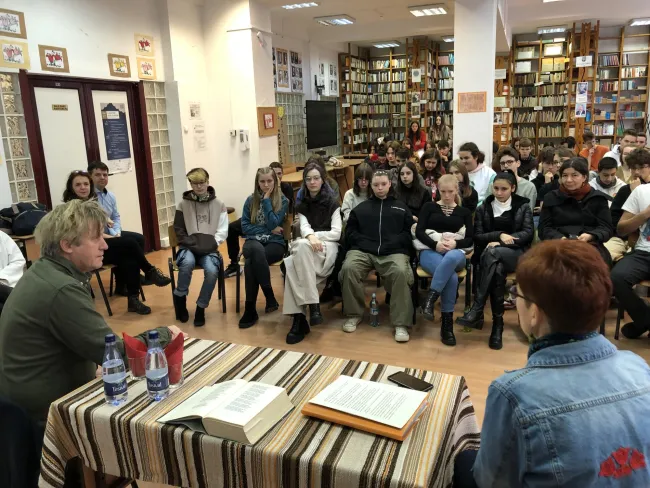 A rendhagyó irodalomóra Petőfi világának bemutatásával folytatódott, melynek során Háy János íróval, költővel Kun-Gazda Kinga-Viola magyar szakos tanárnő beszélgetett Petőfi költészetének értékeiről, időszerűségéről. Egy irodalmi alkotás születésének körülményeiről a meghívott előadó így fogalmazott: