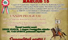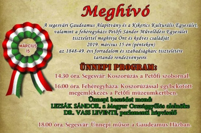 A segesvári Gaudeamus Alapítvány és a Kikerics Kulturális Egyesület, valamint a fehéregyházi Petőfi Sándor Művelődési Egyesület szeretettel meghívja Önt és kedves családját, barátait, határon innen és túl, 2019. március 15-én, pénteken, az 1848-49-es forradalom és szabadságharc tiszteletére tartandó rendezvényeire!
