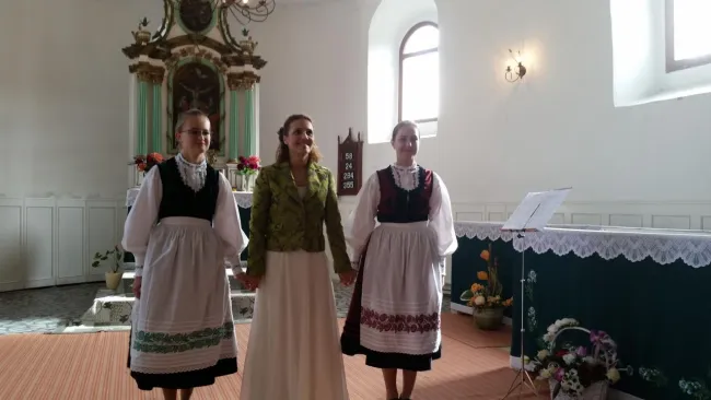 Koródi Levente tiszteletes úr felesége, Kiskapus kis magyar közössége is nagy szeretettel fogadott bennünket. A templomkertbe érve kis vendégvárással kedveskedtek nekünk és az érdeklődőknek. Felemelő érzés volt számunkra, hogy a település legrégebbi épületében, a Kiskapusi Evangélikus-Lutheránus Egyházközség XIII. században épült templomának falai között lehettünk, és egy olyan közösségnek vihettünk egy kis csokrot, összeállítást, ahol a föld újra szomjazik, ahol várják, hogy újra kikelhessen az elültetett mag.