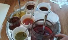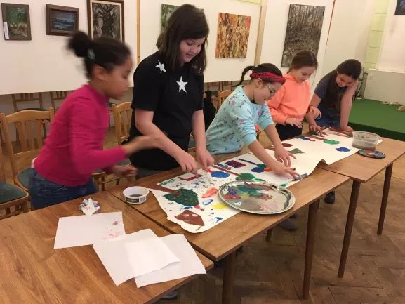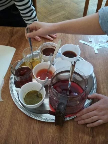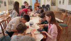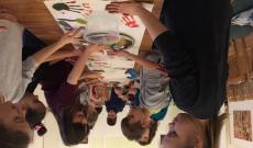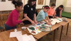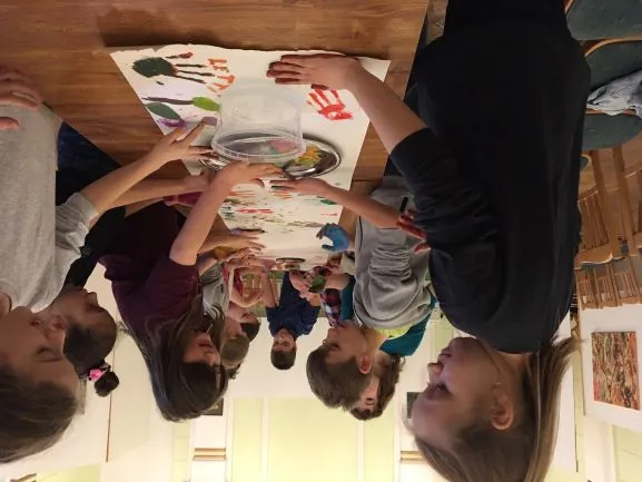 Először is alaposan megnézték a kiállítás képeit, amihez két feladatot kaptak. Össze kellett számolni, hányféle technikát látnak kiállítva, illetve mik lehetnek azok a dolgok, amik nincsenek a helyükön, nem úgy néznek ki, ahogy egy kiállításon megszokhatták. Ezt követően megkeresték azokat a cédulákat, amiken a két festő életéről találtak egy-egy állítást, ezeket kellett a megfelelő név alá társítaniuk. Természetesen nem maradt el a kötetlenebb beszélgetés, ki is emeltünk néhány alkotást az állítások alátámasztására. Végül különböző természetes anyagokból előállított színes-szagos festékeket kellett felismerniük, s egy hatalmas papíron megjeleníteniük az osztályukat, de nem is akárhogy! A természetes festő anyagokat ecsettel vitték fel a papírra, a szokásos festéket pedig kizárólag az ujjukkal, a kettő technikát pedig ötvözniük kellett.