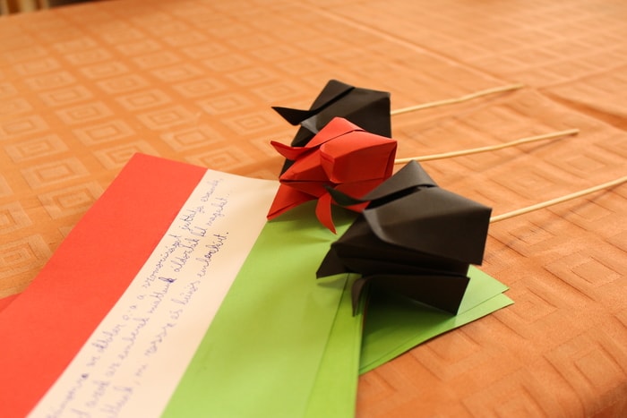 Október 6-án, péntek délután az 5-8. osztályos tanulókkal egy tanteremben összegyűltünk, hogy megemlékezzünk az 1849-ben vértanú halált halt férfiakról. A Zsoboki Általános iskola magyar tanárnője röviden mesélt az akkori eseményekről, arról, hogy miért és kiket végeztek ki, s hogy miért olyan fontos ez a nap a magyarok számára. Ezt követően egy rövid filmben meghallgattuk a 13 honvédtiszt az osztrák hatalommal szembeni fontos követeléseit, és egy rövid megzenésített balladát, melyben a vértanúk történetét ismerhettük meg. Utána az egyik nyolcadikos lány Juhász Gyula: Vértanúink című versét szavalta el. Végül nemzetiszínű ’zászlókat’ osztottunk ki, melyekre a gyerekek ráírták, hogy személyesen a számukra mint jelent október 6-a. A megemlékezést papírból készült tulipánok készítésével fejeztük be.