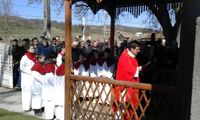 A virágvasárnap misztériuma délután is folytatódik a Kálvária dombon a Golgotán, a keresztút felidézésével. Ezen a verőfényes vasárnapon a mezőségi vicei dombokon messzire hallatszott a keresztúti ájtatosság gyönyörű éneke, melynek szövegét most Önök is megismerhették.