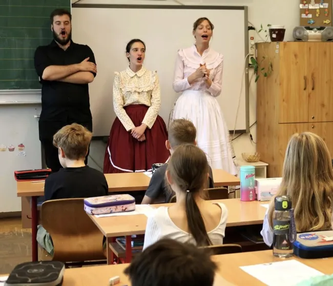 Mi már vasárnap megérkeztünk a szállásra, hogy hétfőn friss erővel vághassunk neki a napnak. Délelőtt két osztályhoz, a negyedikesekhez és a hatodikosokhoz mentünk be elmesélni, honnan jöttünk, s tanítani nekik dalokat. A gyerekeknek nagyon tetszettek a viseleteink és lelkesen válaszoltak kérdéseinkre, énekelték a dalokat. Majd a közösen eltöltött ebéd után indulhatott a “vetélkedő”, ahol megmutathattuk ki mivel készült.