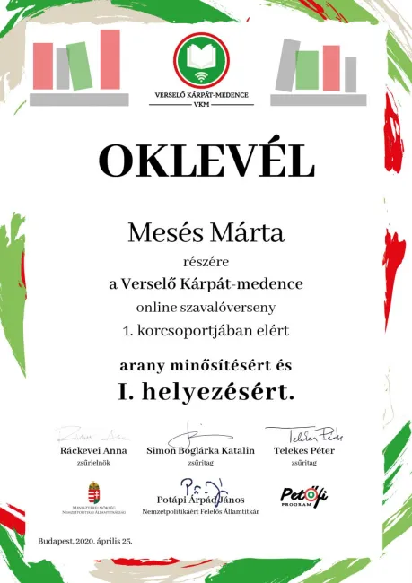 Ami a szavalóverseny legdrámaibb pillanatát illeti, az kétségkívül az eredményhirdetés napjának izgalmai voltak. Minden készen állt, az összes feladatot elvégeztük: az okleveleket megírtuk, a videókat megvágtuk, a bejegyzéseket elkészítettük, és türelmesen vártuk a délután három órát, amikorra a nyilvánosságra hozatalt ígértük. Ám egy kósza viharfelhő éppen abban a pár órában ereszkedett le Beregszász fölé, ahol Bence Norbi kollégánk, az általa összeállított eredményhirdető videót töltötte (volna) fel a közös felületünkre. Egy óra volt már csupán az eredményhirdetésig, az ottani internet sebessége azonban minimálisra csökkent, a videó feltöltésének jelzőcsíkja pedig több órát mutatott... Mind a tízen a számítógépeink előtt ültünk, miközben a bő hónapos munkánk lezárása már csak pár percnyire volt tőlünk. Egymást támogatva végül megoldottuk ezt a problémát is. Aznap este pedig, mintha egy hosszú, dolgos nap után a kedvenc munkatársainkkal ülnénk össze meginni egy bambit, mi is beültünk otthon a laptopok elé, és egy öt alkalommal meghosszabbított videóbeszélgetésen kinevettük magunkból az elmúlt hónapot.