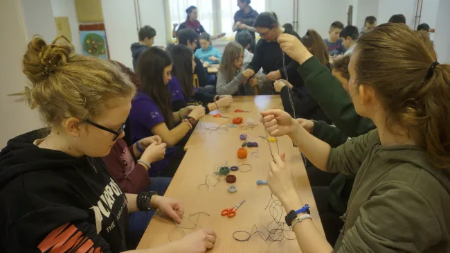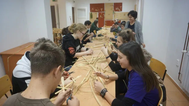 A tartalmas délelőttöt finom ebéd követte, aztán újabb érdekesnél érdekesebb programok: a bogozás egy újabb formáját sajátíthattuk el, illetve a népi mesterségek közül a gyékény feldolgozásával ismerkedtünk meg. A népi játékokat kivétel nélkül élveztük, újakat is tanultunk. A mesemondó hölgy igencsak lekötötte figyelmünket tanulságos és egyben tréfás történeteivel a szegény legényről, leányról, kondásról, királyfiról, lábaskáról, Éváról, Ádámról, aranyfészekről és királyról. A vacsorát követően izgatottan készült mindenki a táncházba. A talpalávalót egy négytagú zenekar biztosította fáradhatatlanul. Aki tehette, táncolt, énekelt, jól mulatott.