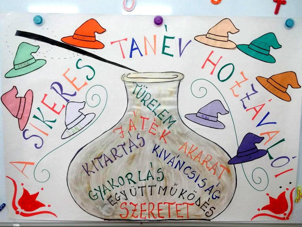 A tanszerek kiosztása után közösen elkészíthették az idei tanév bájitalát. A bájital receptjéhez a türelem, játék, akarat, kitartás, gyakorlás, együttműködés, kíváncsiság, szeretet kell és mindez csak akkor valósítható meg, ha vannak gyerekek, akikkel ezt mind el lehet érni.